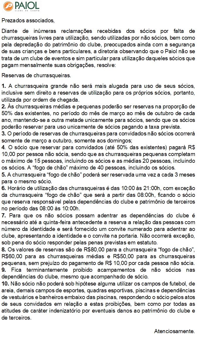 INFORMATIVO NOVAS NORMAS PARA RESERVAS CHURRASQUEIRAS E ACAMPAMENTO