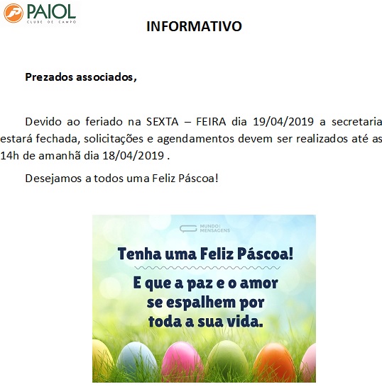 FERIADO SEXTA FEIRA 19/04/2019.