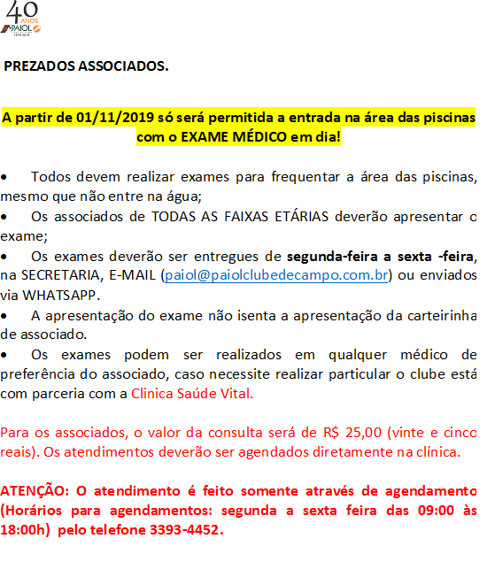 EXAMES MÉDICOS ÁREA DAS PISCINAS.