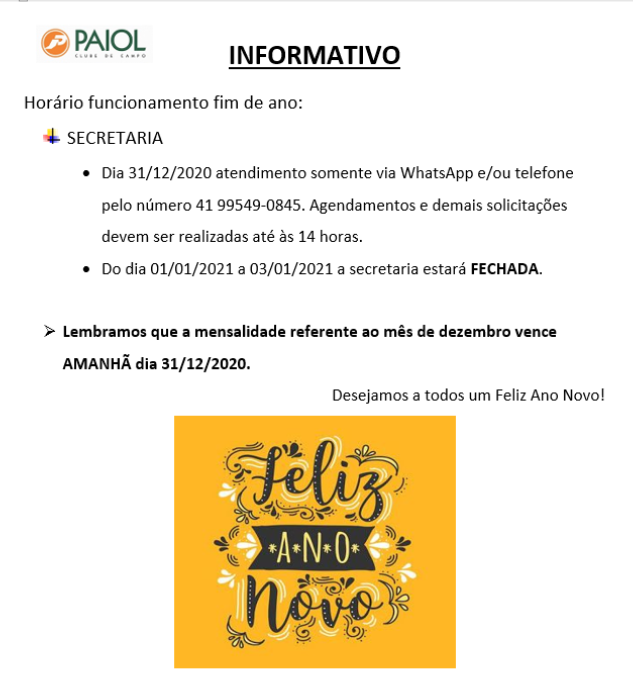 HORÁRIO FIM DE ANO E VENCIMENTO MENSALIDADE