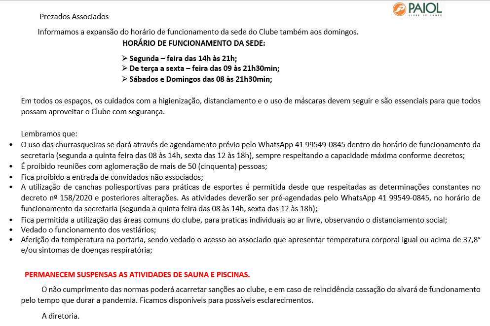 NOVO HORÁRIO FUNCIONAMENTO SEDE
