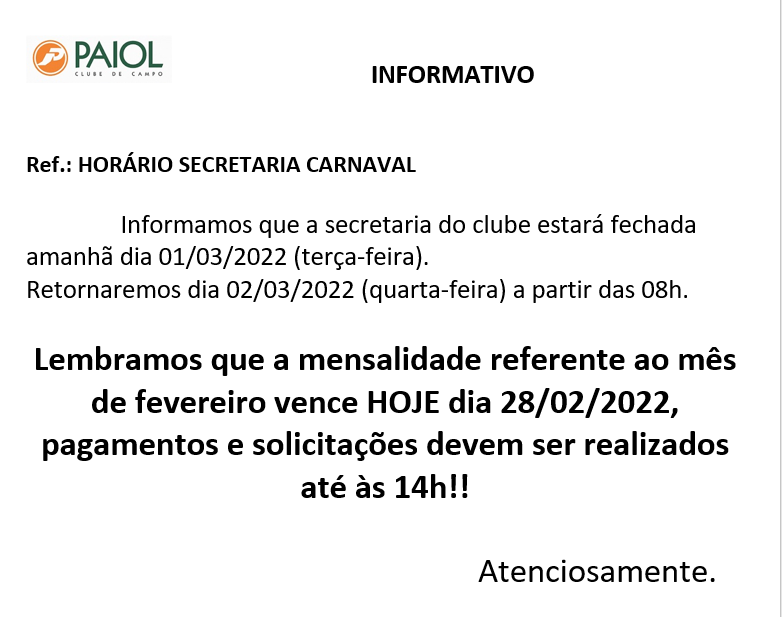 HORÁRIO SECRETARIA NO CARNAVAL E VENCIMENTO