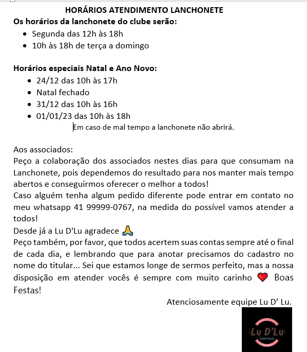 HORÁRIOS LANCHONETE