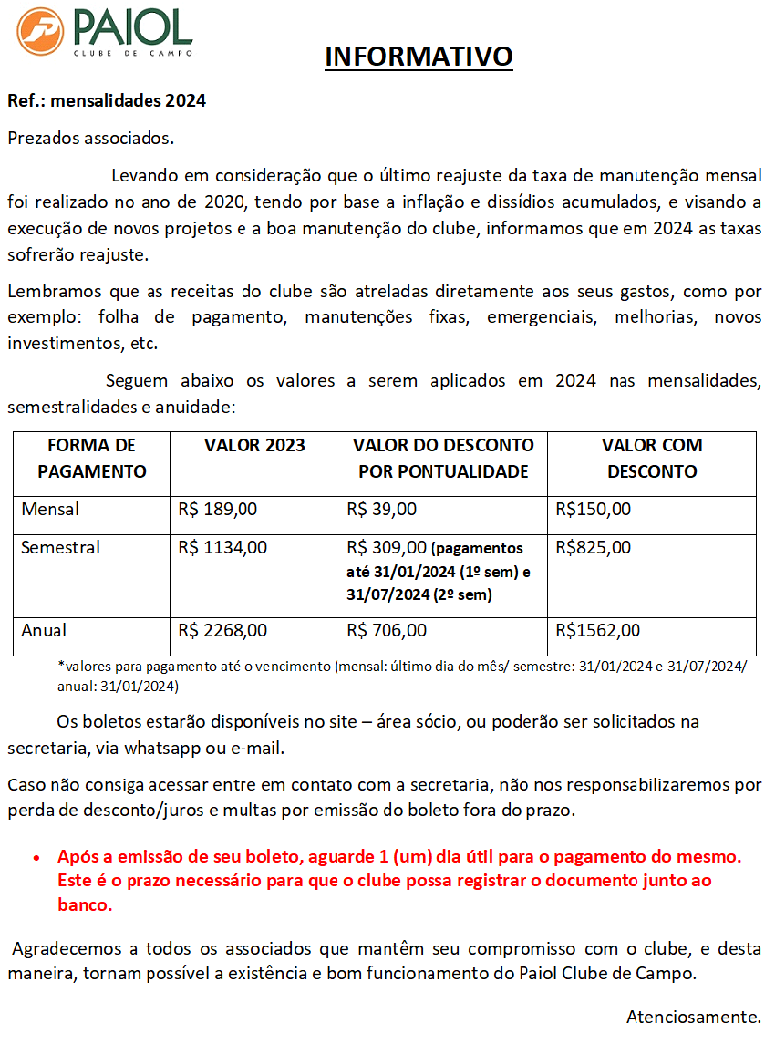 REAJUSTE TAXA DE MANUTENÇÃO 2024